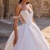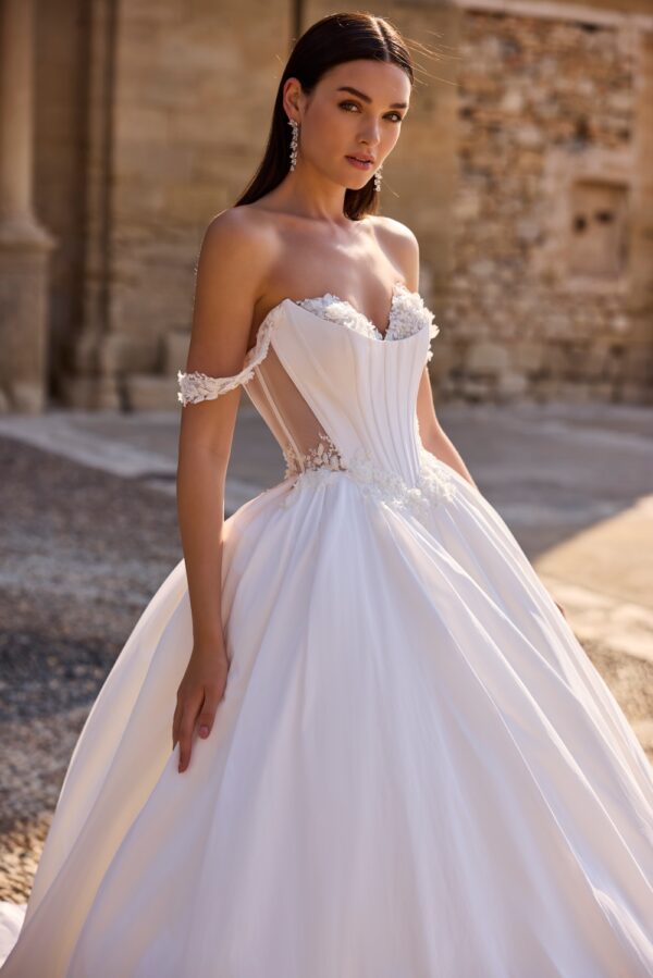 De off-shoulder halslijn omlijst de schouders op sierlijke wijze, terwijl de weelderige pofmouwen van tule en bloemenapplicaties zorgen voor een dramatische touch vol zachtheid. De subtiel hartvormige bustier is verfijnd gecentreerd met baleinen, wat zorgt voor een prachtige pasvorm en een elegante taille. De volumineuze rok van glanzende stof vloeit majestueus naar de grond, met een elegante sleep voor een onvergetelijke entree.