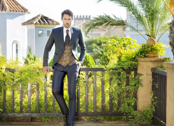Dit donkerblauwe trouwpak van Enzo Romano met goudkleurig jacquard dessin is een uitgesproken en elegante keuze voor de bruidegom die luxe en karakter wil uitstralen. De combinatie van diep blauw met warme goudtinten geeft het pak een rijke, koninklijke uitstraling.