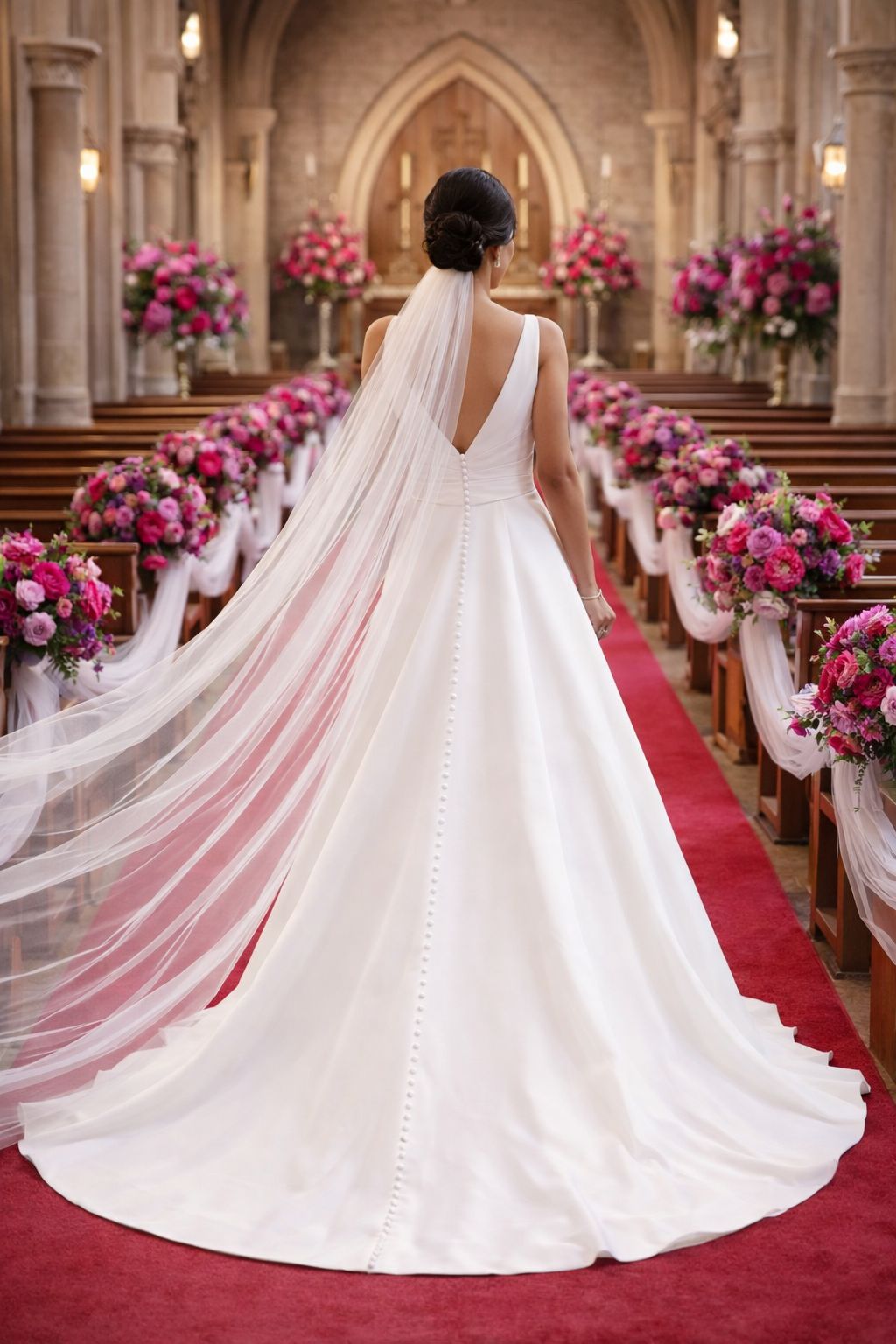 Het slanke lijfje met verfijnde plooien en een elegante V-hals zorgt voor een prachtig silhouet, terwijl de soepel vallende, iets wijdere rok bij elke beweging prachtig meebeweegt. De diepe V-rug en de rij verfijnde knoopjes die doorlopen tot het einde van de sleep geven de jurk een subtiele, maar indrukwekkende finishing touch.