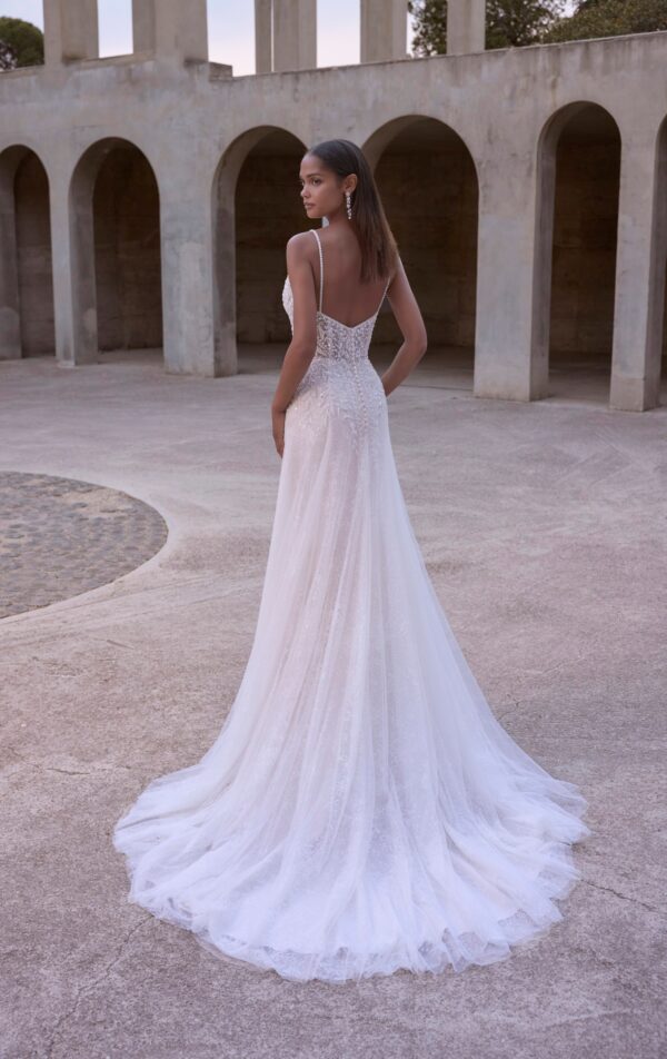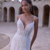 Trouwjurk Charis met couture uitstraling. Deze fit en flare trouwjurk heeft een aangepaste sweetheart halslijn op een pailletten en kralen geborduurd lijfje met bloemen in glittertule. Deze trouwjurk met couture uitstraling komt uit de Goddess Collectie en uitgevoerd in de kleuren :Ivoor/Champagne/Honing