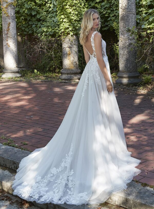 Uitwaaierend en mooi, onze 4153 Parthena trouwjurk is een bloemenfantasie in een zachte zomerteint. Het corsetlijfje heeft een eenvoudige v-hals met driedimensionale, geborduurde kanten applicaties met bloemen die de jurk versieren. De luchtige tule rok zweeft van het lichaam, terwijl de met kant gevoerde split meer beweging aan de jurk toevoegt en een sexy split die af en toe een deel van je been toont. Getoond in Ivoor/Champagne/Honing.