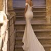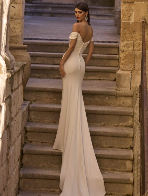Met een geplooid lijfje en bruidsknopen, in een lichtgewicht, zachte crêpestof.