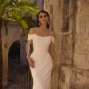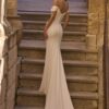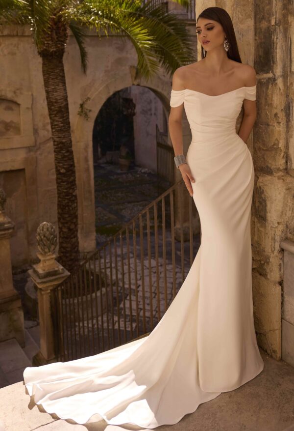 Een mooie fit en flare, off-the-shoulder, strapless trouwjurk.