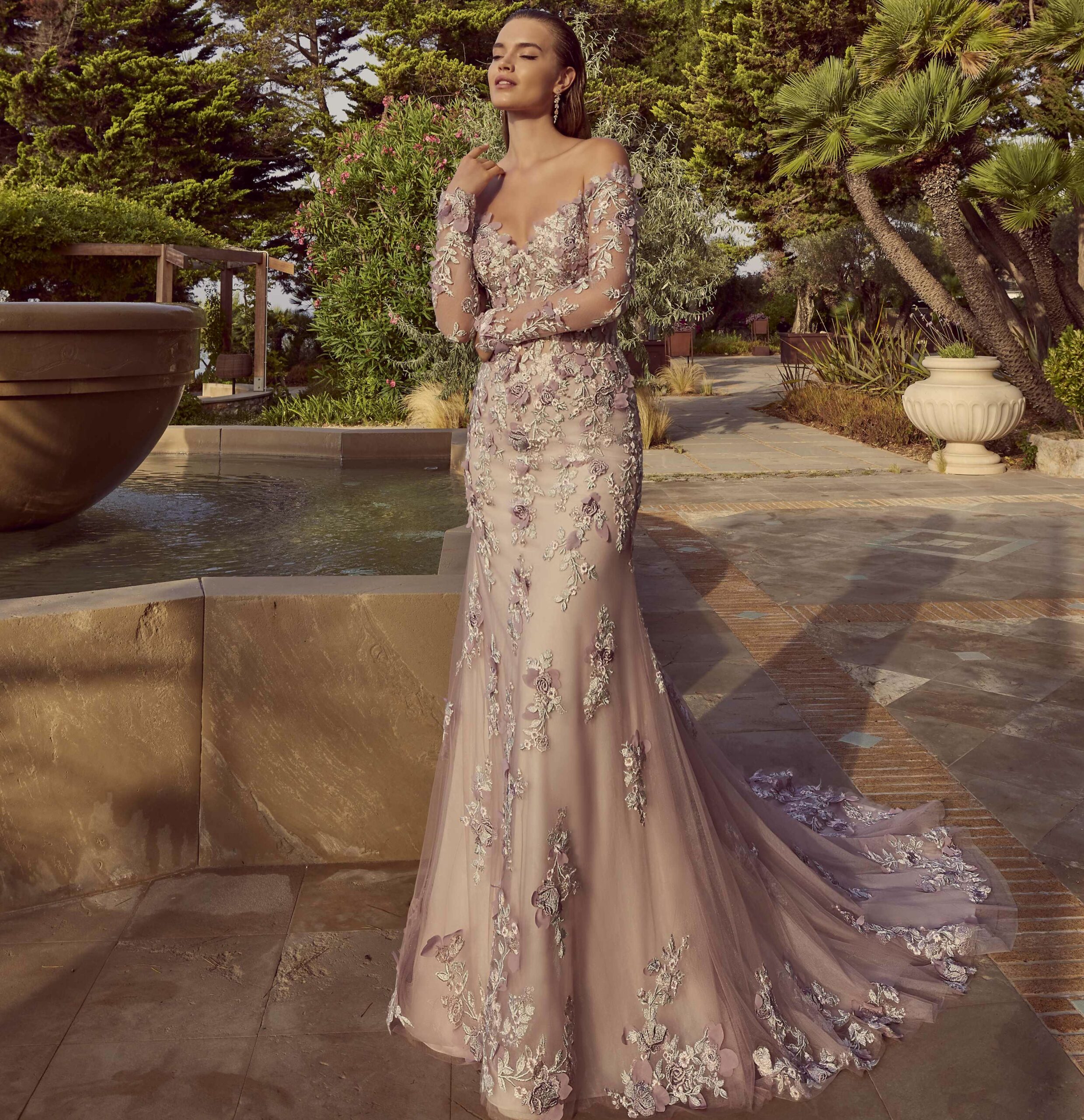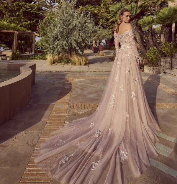 Voor de bruid die stijlvol wil trouwen en eens iets anders zoekt dan de wijde ivoorkleurige bruidsjurk is dit echt een beauty, de nieuwste belijning en prachtig afkledend. Off shoulder en met zelfs nog een extra afneembare sleep en schouderstola in de kleur oud roze met pastel accenten Is het geen plaatje?
