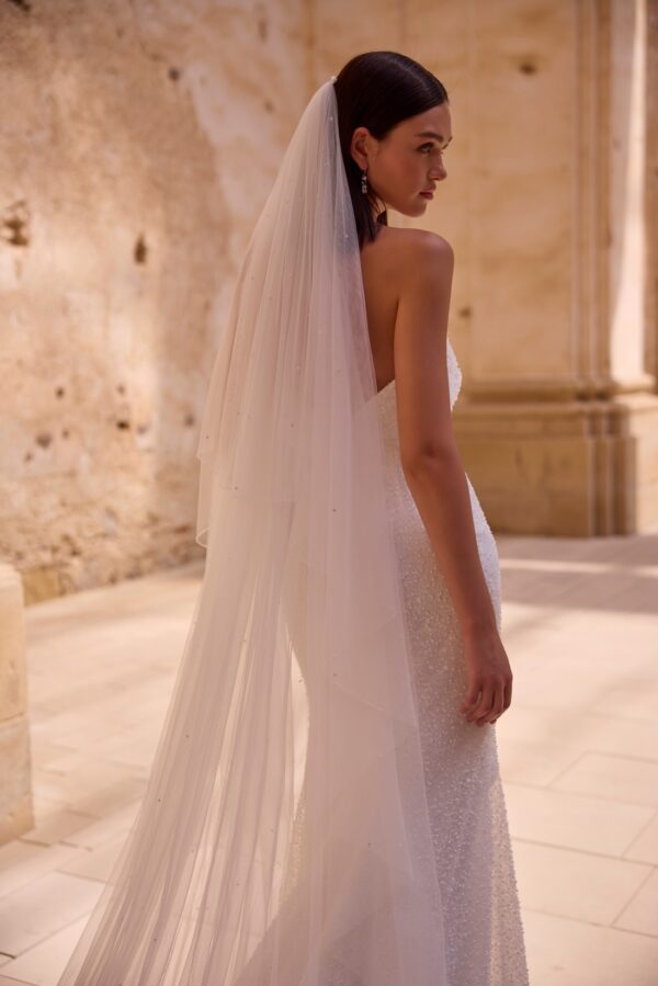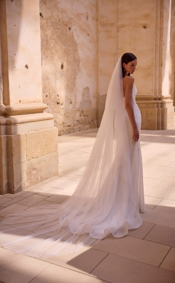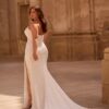 Ontdek de ultieme trouwjurk voor de glamour bruid: deze prachtige fit & flare bruidsjurk combineert elegantie met een vleugje sex appeal. Het aansluitende silhouet accentueert de vrouwelijke vormen, terwijl de pailletten en de parels zorgen voor een luxueuze uitstraling. De jurk heeft een goed zittende ondersteunende moderne hals en een goed aansluitende rug, wat zorgt voor een adembenemend effect bij elke stap richting het altaar.