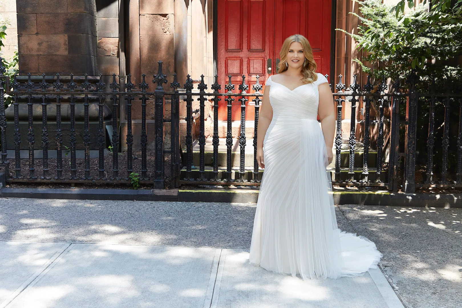 Deze trouwjurk voor de vollere bruid is speciaal ontworpen met plus-size bruiden in het achterhoofd. De asymmetrisch gedrapeerde zachte netjurk creëert een chique en textuurlook op een curve-hugging fit en flare jurk. De perfect getemporiseerde ruching helpt om een soepel en geperfectioneerd silhouet te creëren met delicate kapmouwen en een fly-away frontdrape voor meer visuele interesse en een beetje drama. Getoond in ivoor/champagne.