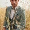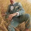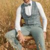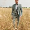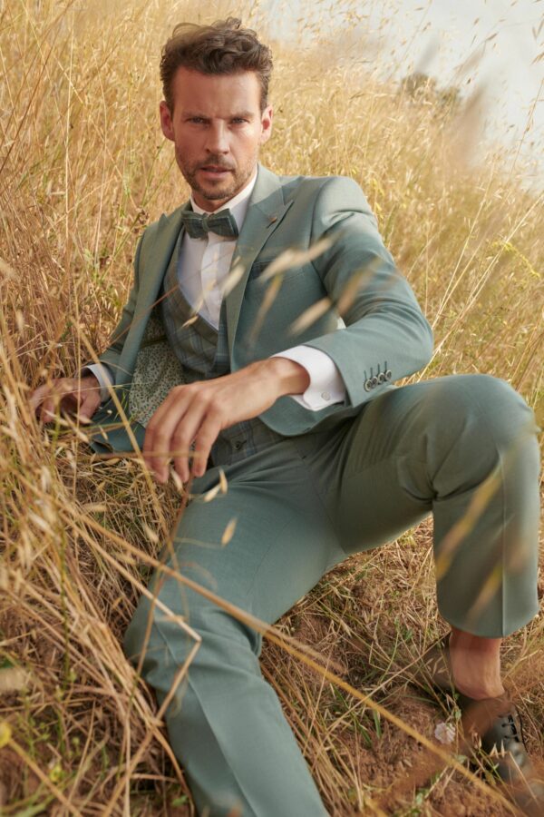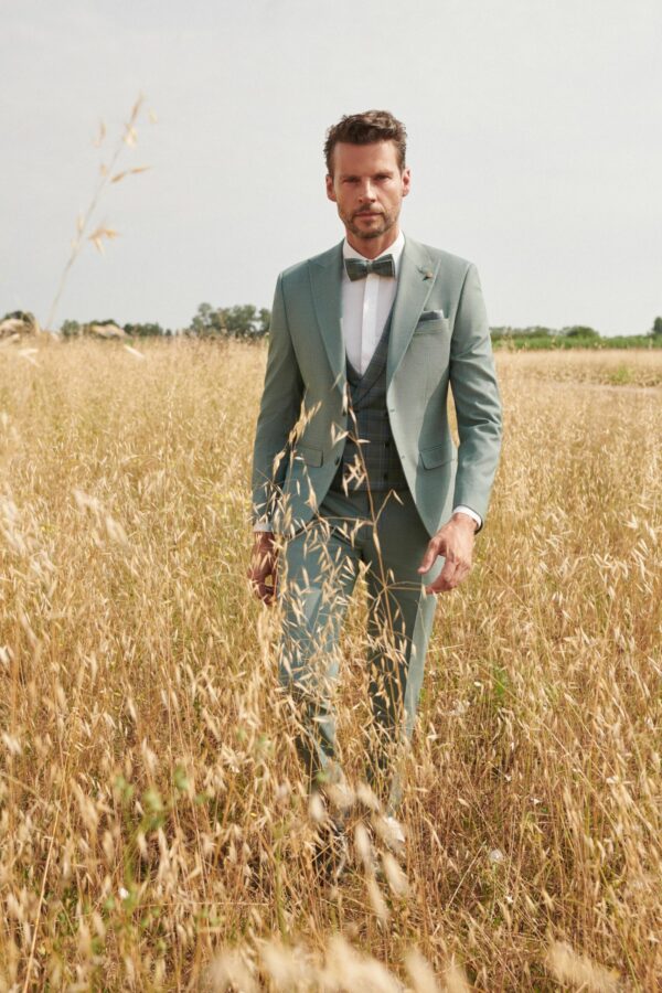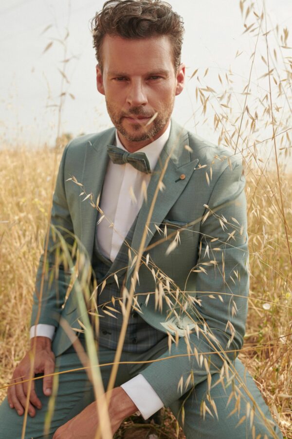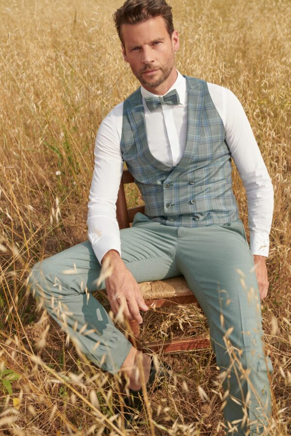 Heerlijk zachtgroen zomerpak van Roberto Vicentti met een geblokt gilet en bijpassende accessoires