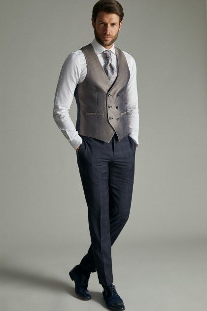 Het trouwpak Roberto Vicentti 14.23.300 is gemaakt voor de man die wil binnenkomen met uitstraling. Dit 3-delige pak in diep nachtblauw heeft een subtiel ruitmotief dat direct klasse uitstraalt, zonder overdreven te zijn. Het stoere champagnekleurige gilet geeft het pak net dat extra karakter en maakt de look compleet.