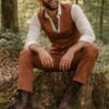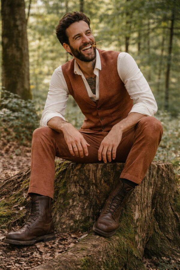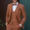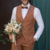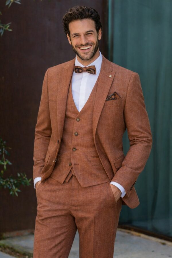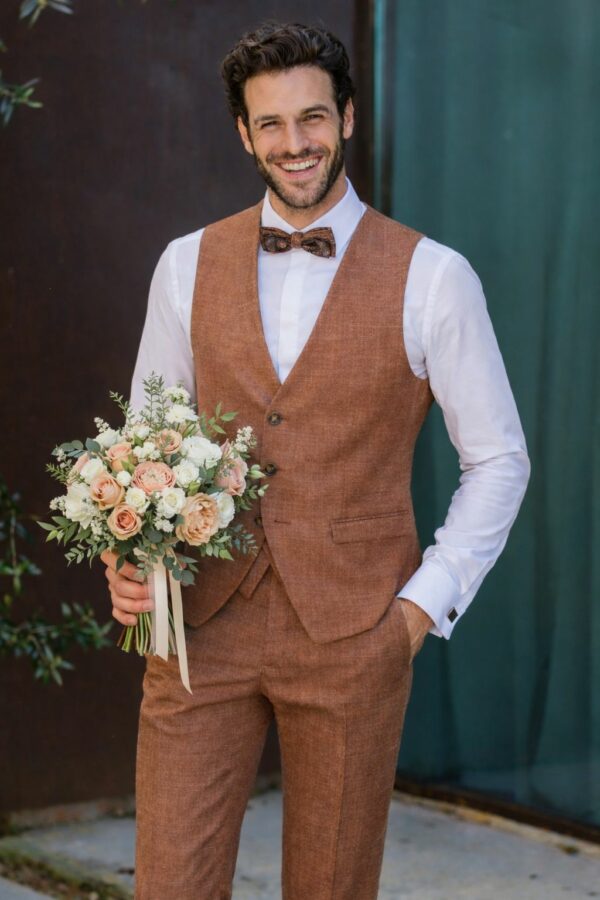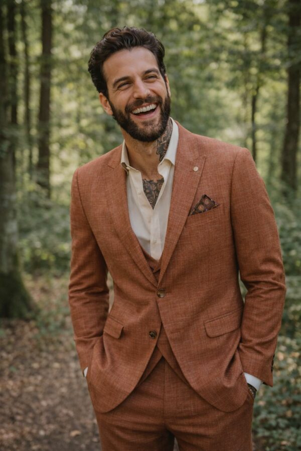 De warme terracotta kleur geeft het pak karakter, zonder schreeuwerig te zijn. In combinatie met het gilet en de zachte stof ontstaat een look die zowel netjes als ontspannen aanvoelt.