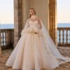De volumineuze rok geeft een sprookjesachtig silhouet, perfect voor de bruid die groots wil stralen.