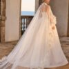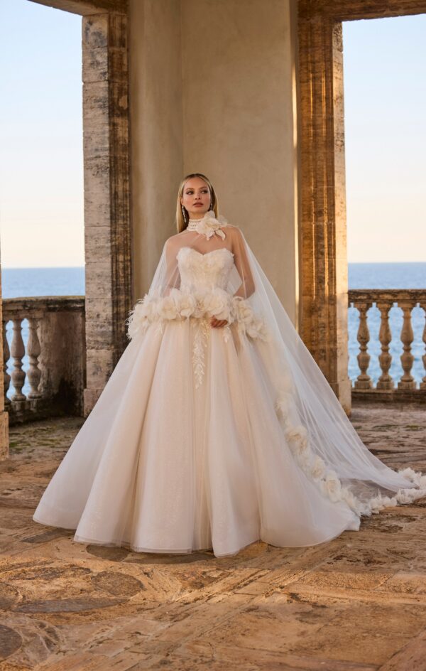 De afneembare cape met bloemaccenten op taillehoogte zorgt voor een extra vleugje drama — ideaal voor de ceremonie, waarna je zonder cape een lichtere en dansbare look hebt.
